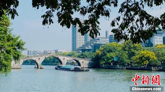 “一座拱宸桥,半部杭州史”。拱宸桥横跨在京杭大运河杭州段已有三百多年,是杭州古桥中最长最高的三孔石桥。其始建于明崇祯四年,是大运河杭州段重要的遗产点之一,是大运河到杭州的“终点标志”,也是运河两岸繁华的重要见证者。图为横跨于京杭大运河上的拱宸桥。