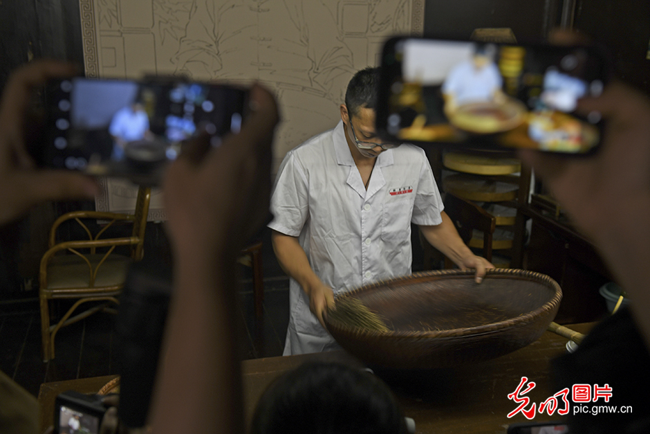 2023年9月18日,媒体记者在杭州市上城区清河坊历史文化特色景区胡庆余堂拍摄手工泛丸。(光明网记者 潘迪摄/光明图片)