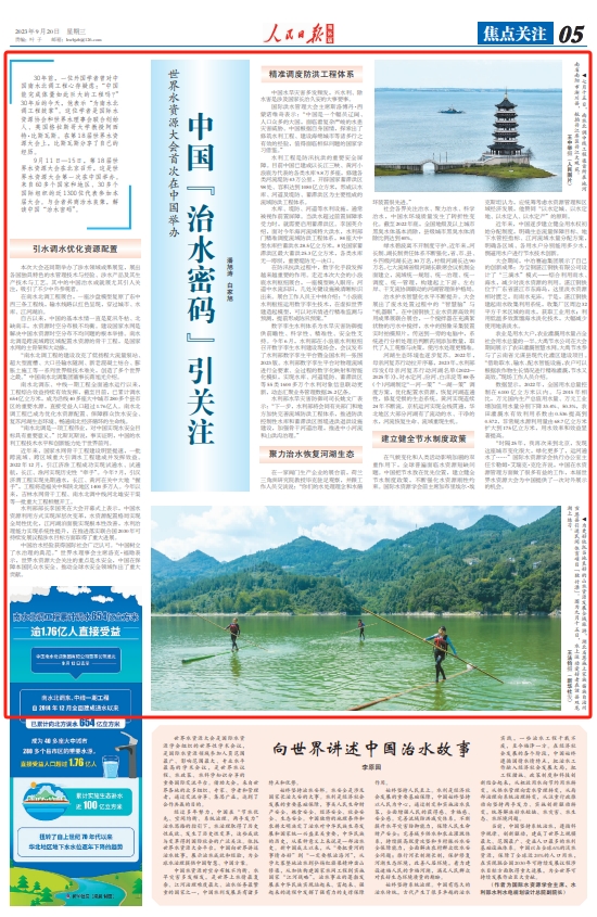 9月11日—15日,第18届世界水资源大会在北京召开,这是世界水资源大会第一次在中国举办。来自60多个国家和地区、30多个国际组织的近1300位代表参加本届大会。与会者共商治水良策,解读中国“治水密码”。