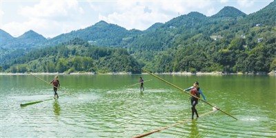 为更好依托当地良好的山水资源发展全域旅游,湖北省恩施土家族苗族自治州宣恩县引进民间体育项目“独竹漂”。图为九月十五日,水上运动爱好者在该县双龙湖上练习。王法钧 摄(新华社发)