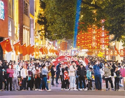 北京路,是广州建城2000多年从未偏移、从未断代的城市中轴线,也是全国最早实行步行化管理的商业街。同时,北京路商圈是首批全国示范智慧商圈。图为在位于广州市越秀区的北京路步行街,大批市民和游客前往游览,并在路口驻足观看大型裸眼3D动画。魏劲松 摄(人民图片)