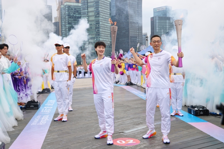 第1棒火炬手陈雨菲和第二棒火炬手、西湖大学校长施一公进行火炬交接
