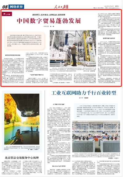“中国数字贸易发展势头迅猛,这得益于中国在数字贸易领域的一系列优势。”山东产业技术研究院数字经济研究所首席经济学家许余洁表示,作为全球第二大数字经济体,2022年中国数字经济规模突破50万亿元人民币,占国内生产总值比重达到41.5%。此外,中国近年来在5G、数据中心、云计算等数字基础设施建设方面取得显著进展,在大数据分析、移动支付体系、物流配送等领域也处在全球前列,这些都为数字贸易发展奠定了坚实基础。