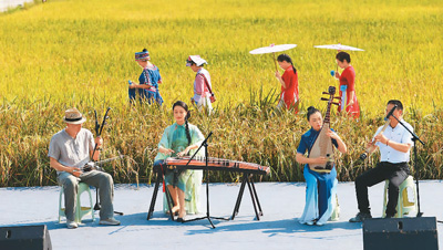 9月10日,在重庆市黔江区太极镇李子村金鸡坝农业示范园的稻田里,举办了一场以“庆丰收,促和美”为主题的秋收稻田音乐会。图为演员进行民乐合奏。