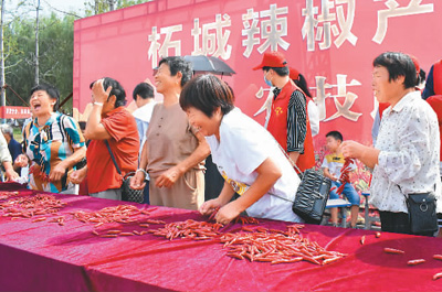 日前,河南省柘城县举办辣椒产业大会。图为当地农民参加趣味比赛。
