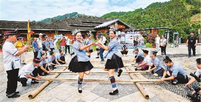 位于广西壮族自治区柳州市三江侗族自治县境内的程阳八寨,依托民族特色打好旅游品牌,让村民吃上“旅游饭”。图为侗寨村民在跳竹竿舞。