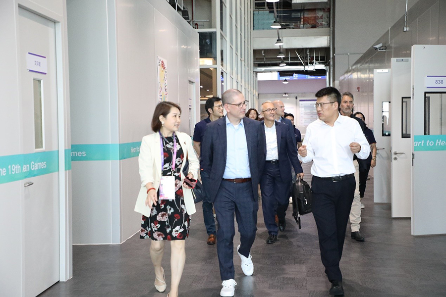 9月18日下午,国际奥委会首席信息科技官艾拉里奥·孔纳一行考察杭州亚运会信息技术指挥中心。(图片来自杭州亚运会官网)