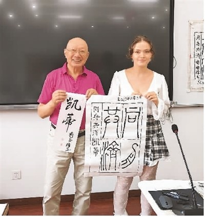 我最喜欢的是书法课,中国书法是以汉字为依托的古老艺术形式,很让人着迷。在书法老师的笔下,我们的中文名字有了不一样的美,就像画一样。