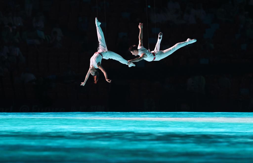 导演团队介绍说,3D双威亚是专门为本次开幕式设计的,两个演员身上都有4根控制不同方向的钢丝绳,最快飞行速度是每秒4米。在飞行过程中,系统可以自动检测轨道是否安全,如果可能出现摩擦碰撞,就会停止飞行保护演员。