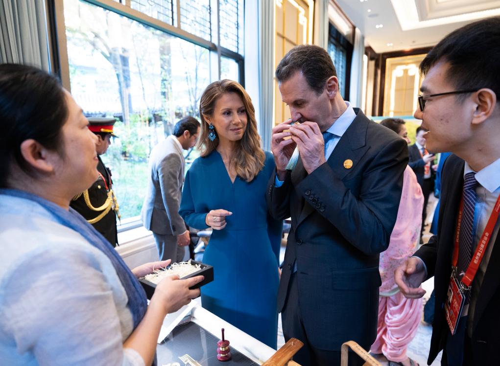 叙利亚总统巴沙尔和夫人阿斯玛欣赏杭绣展示。新华社记者 黄敬文 摄