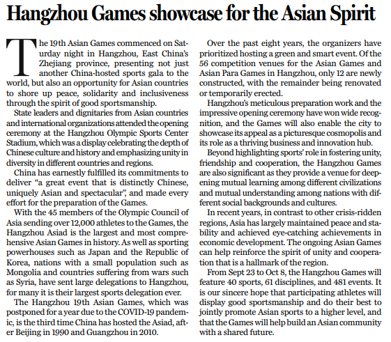 第十九届亚洲运动会于9月23日晚在杭州隆重开幕,这不仅是中国主办的又一场体育盛会,也是亚洲各国以体育促和平、团结、包容的重大机遇。