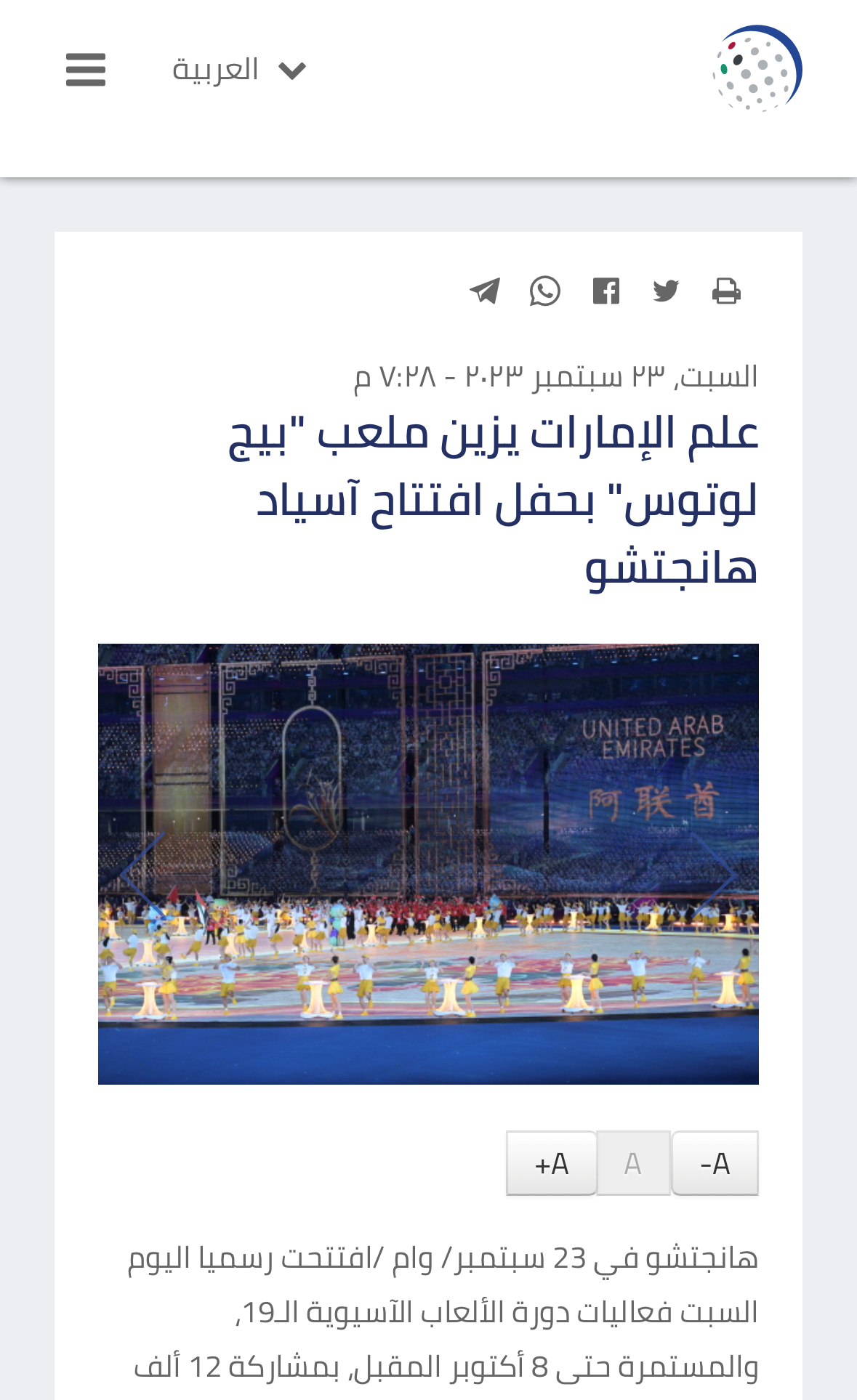 同样在23日,阿联酋国家通讯社(Emirates News Agency)发表题为《阿联酋国旗点缀杭州亚运会“大莲花”体育场》的报道。报道称,中国国家主席习近平当晚宣布了亚运会的开幕。杭州亚运会的开幕式精彩纷呈,突出展现了主办国的文化遗产,重点关注可持续发展和环境保护领域的实践,同时凸显古代文明独有的特征。杭州亚运会的举办正是收获果实、收获喜悦的时刻,东道主将与亚洲各国来宾共同分享。