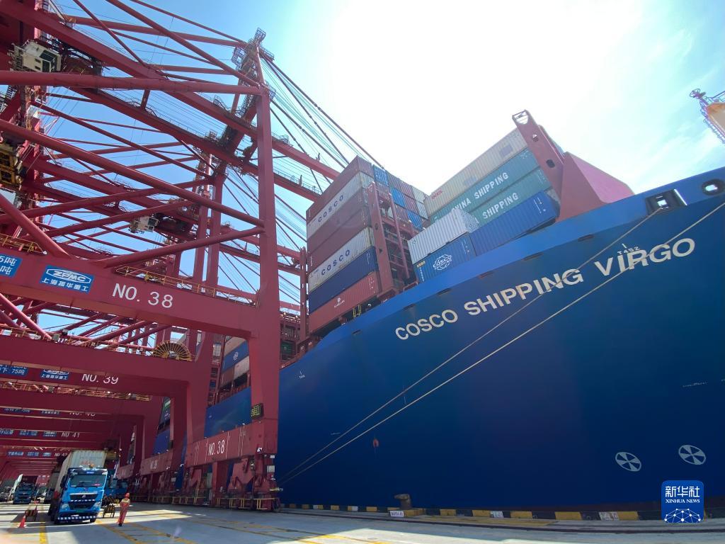 8月21日,“中远海运室女座”号集装箱船停靠在宁波舟山港梅山港区。 新华社记者 魏一骏 摄