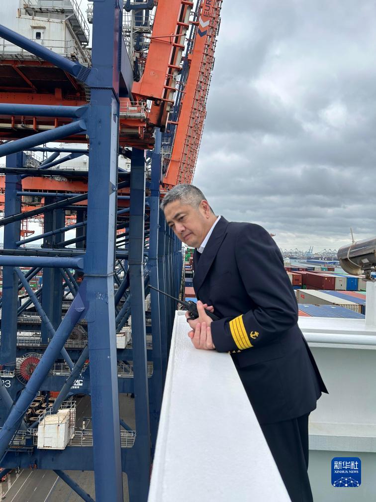 9月20日,在“中远海运室女座”号集装箱船靠泊荷兰鹿特丹港过程中,船长莫卫东查看船体与码头情况。 新华社发(受访者供图)
