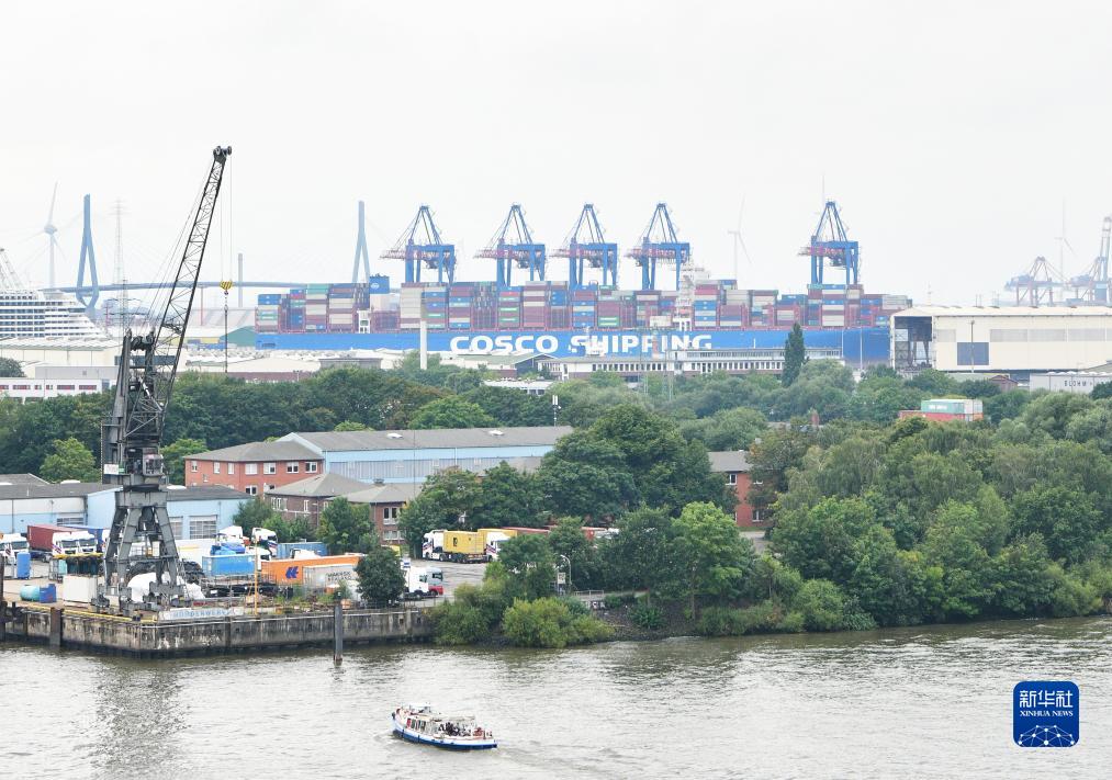 8月12日,一艘中远海运集团货轮停靠在德国汉堡港。 新华社记者 任鹏飞 摄