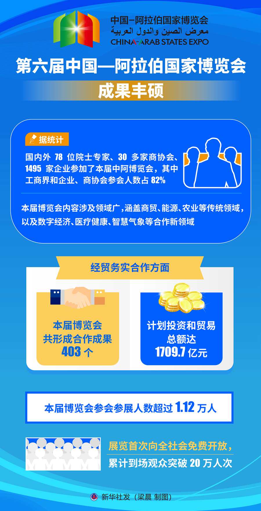 据统计,国内外78位院士专家、30多家商协会、1495家企业参加了本届中阿博览会,其中工商界和企业、商协会参会人数占82%。本届博览会内容涉及领域广,涵盖商贸、能源、农业等传统领域,以及数字经济、医疗健康、智慧气象等合作新领域。