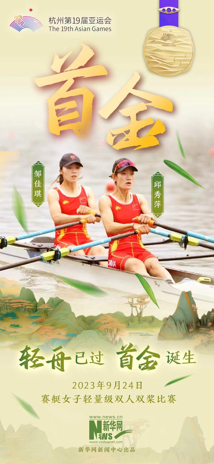 24日上午,杭州亚运会首金诞生,中国选手邹佳琪/邱秀萍在赛艇女子轻量级双人双桨比赛中夺得金牌。