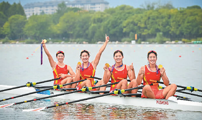 9月25日,中国选手陈云霞、张灵、吕扬、崔晓桐(从左到右)手举金牌在赛艇上庆祝。