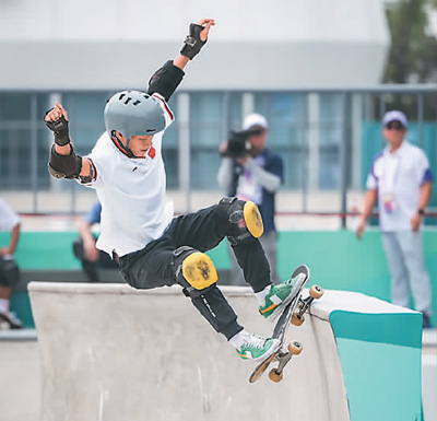 9月25日,陈烨在杭州亚运会滑板男子碗池决赛中。