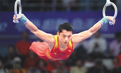 9月24日,中国队选手邹敬园在竞技体操男子团体决赛吊环项目比赛中。