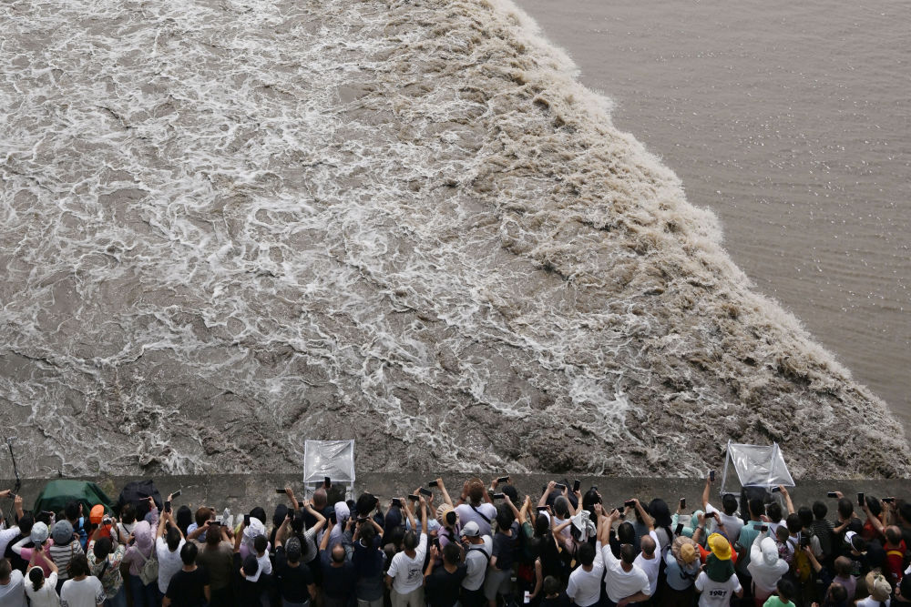 这是中秋当日游客们在观看钱塘江潮