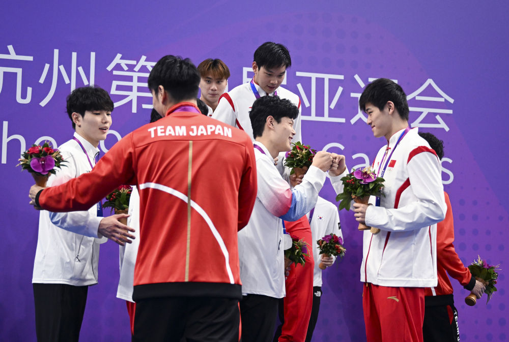 9月28日,中国队选手在男子4X100米自由泳接力决赛后与韩国队和日本队选手致意。