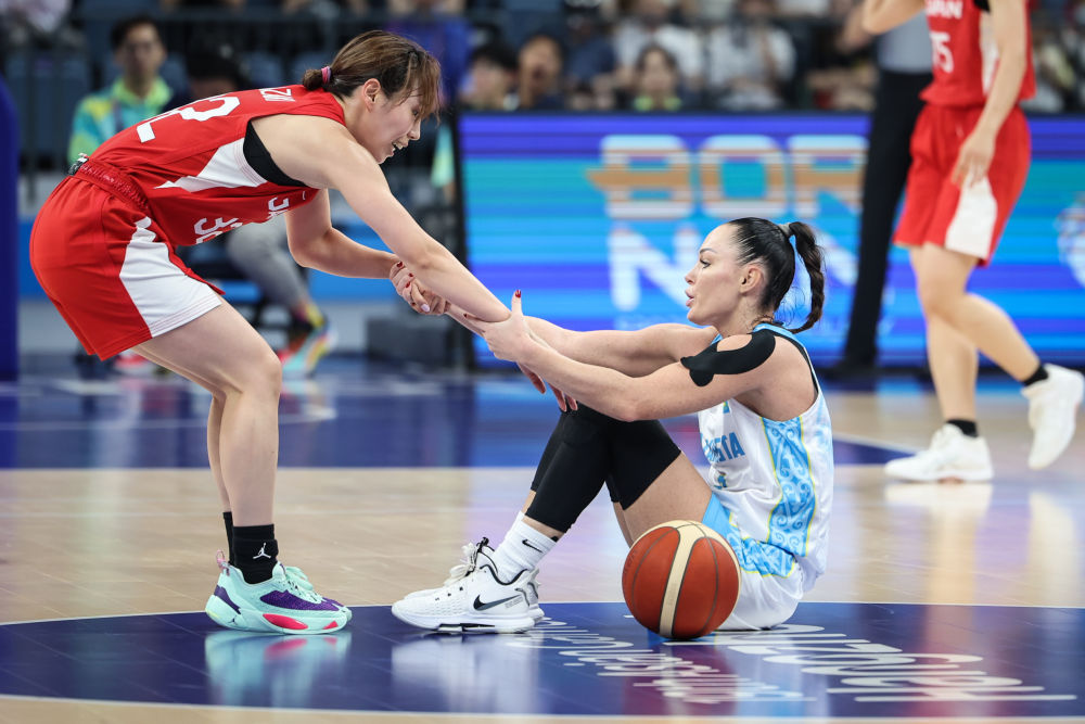 9月29日,日本队球员宫崎早织(左)在篮球女子预赛B组比赛中拉起哈萨克斯坦队球员阿纳斯塔西娅·阿利绍斯凯特·洛帕京娜。