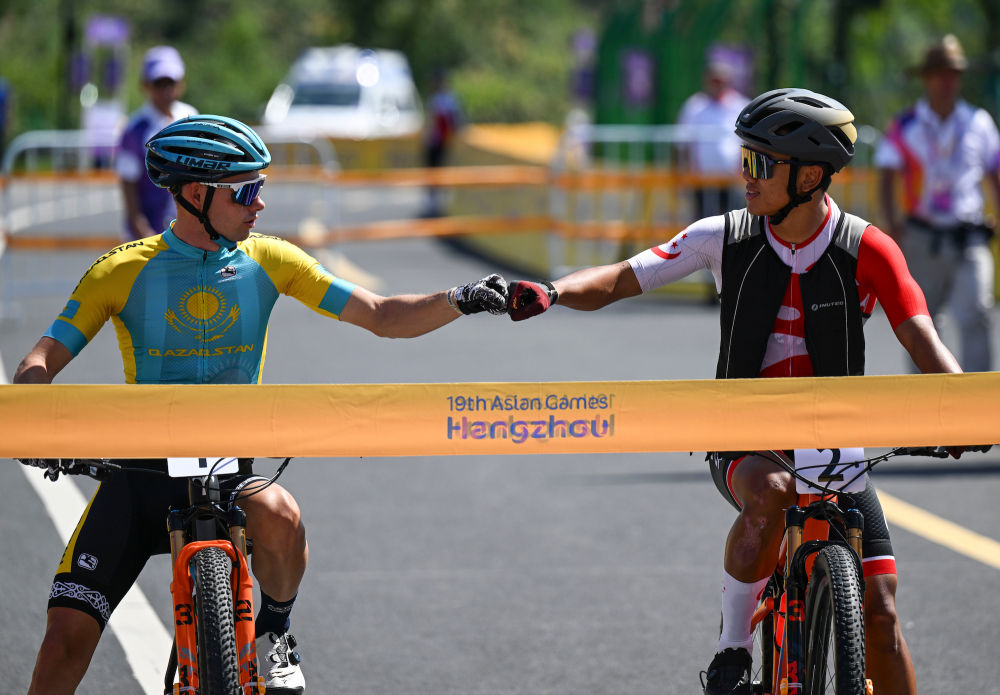 9月25日,哈萨克斯坦选手丹尼斯·谢尔吉延科(左)和新加坡选手宾·卢克曼·里亚德·哈基姆在山地自行车男子奥林匹克越野赛出发前相互致意。
