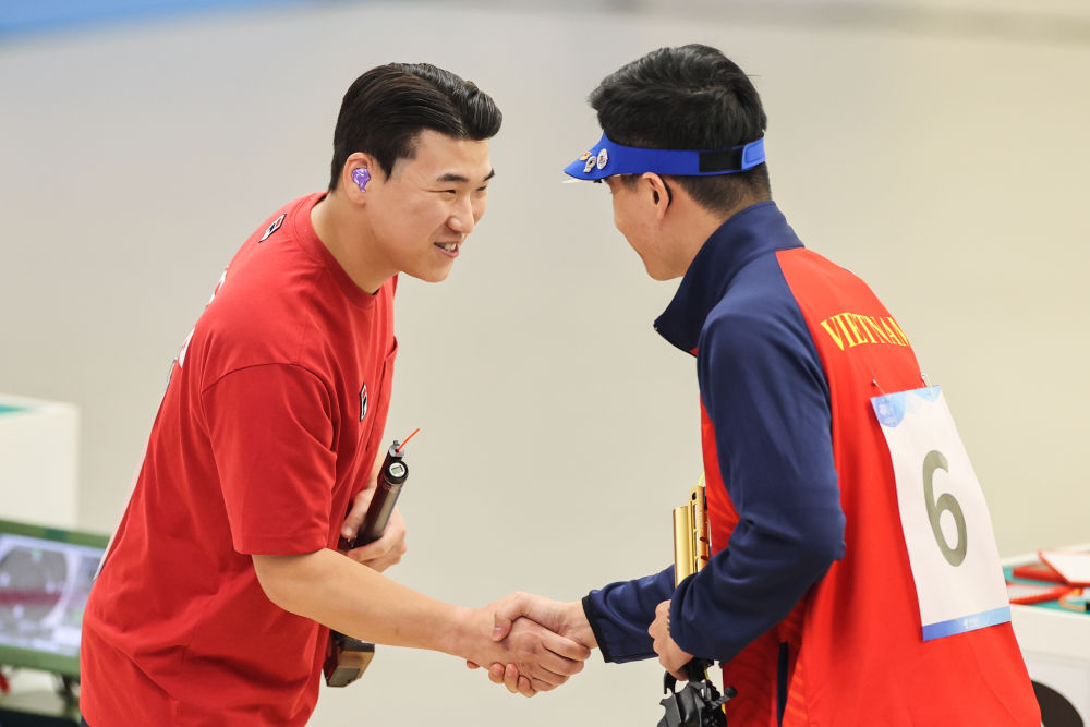 9月28日,韩国选手李元昊(左)与越南选手范光辉在男子10米气手枪个人决赛后握手致意。