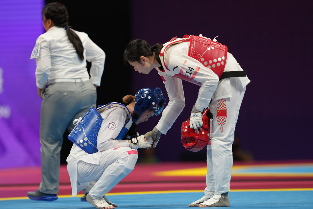 9月27日,宋洁(右)与张芮恩在跆拳道女子67公斤级1/4决赛后握手致意。
