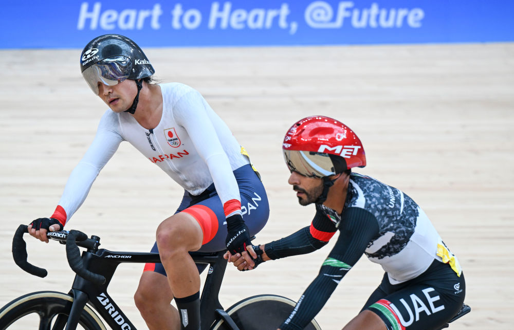 9月28日,日本选手窪木一茂(左)和阿联酋选手艾哈迈德·曼苏里在场地自行车男子全能赛冲刺赛后握手致意。
