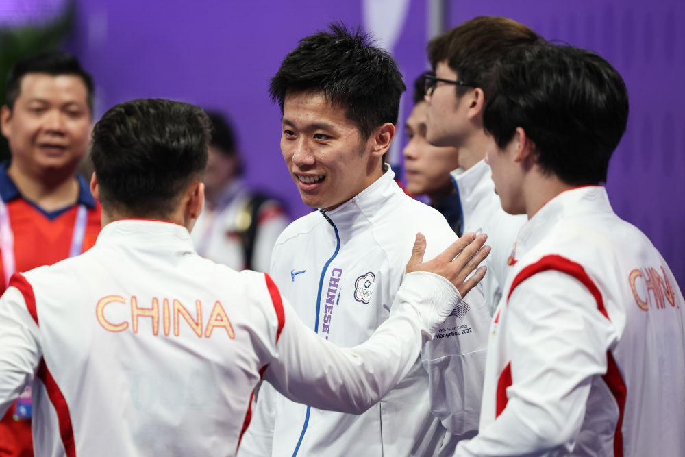 9月28日,中国台北选手李智凱(中)和中国队选手在体操鞍马决赛中互致问候。