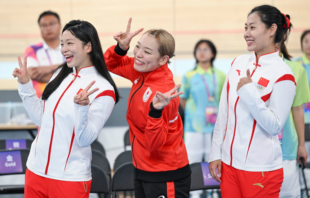 9月27日,冠军日本选手佐藤水菜(中)、亚军中国选手王丽娟(左)、季军中国选手张琳茵在场地自行车女子凯林赛颁奖等候区合影。
