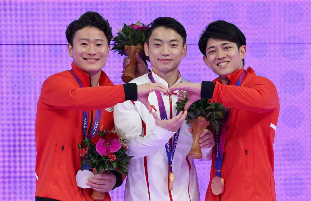 9月29日,亚军日本选手北园丈琉、冠军中国选手邹敬园和季军日本选手谷川翔(左至右)在体操男子双杠颁奖仪式上。