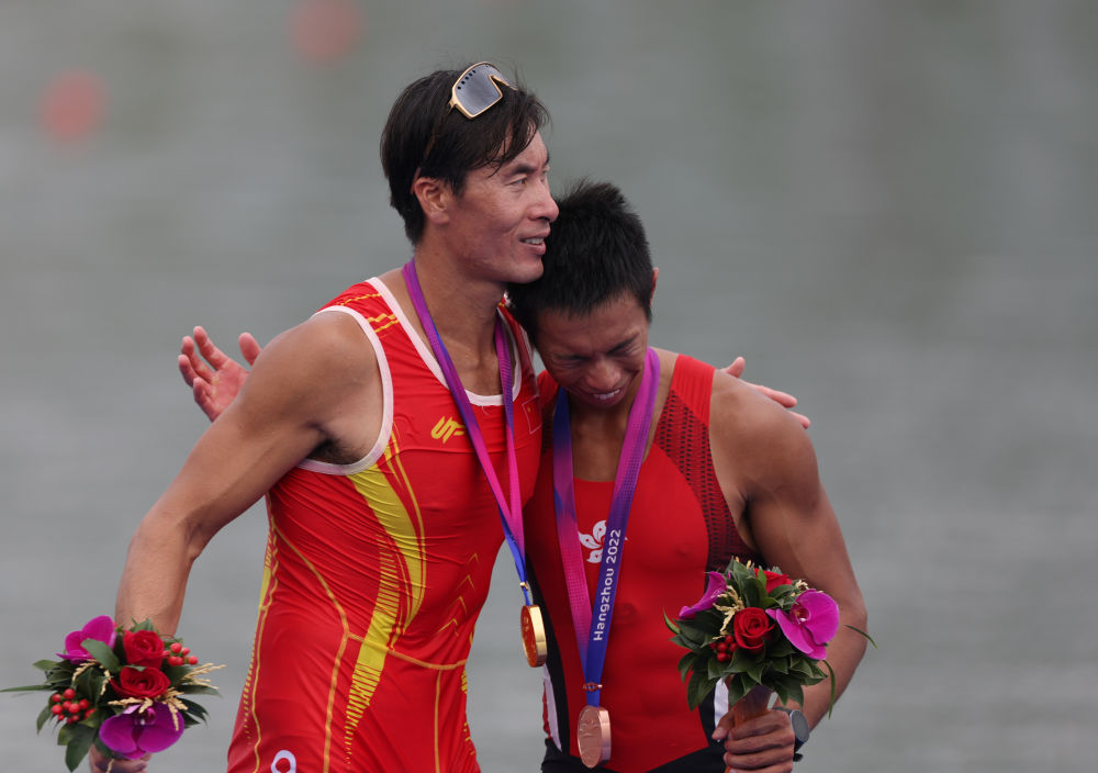 9月25日,冠军中国选手张亮(左)与季军中国香港选手赵显臻在男子单人双桨颁奖仪式后拥抱致意。