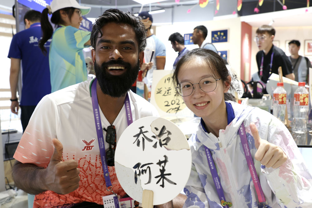 9月29日,马尔代夫羽毛球运动员穆罕默德·阿杰凡·拉希德(左)在亚运村乐活集市与工作人员合影留念。