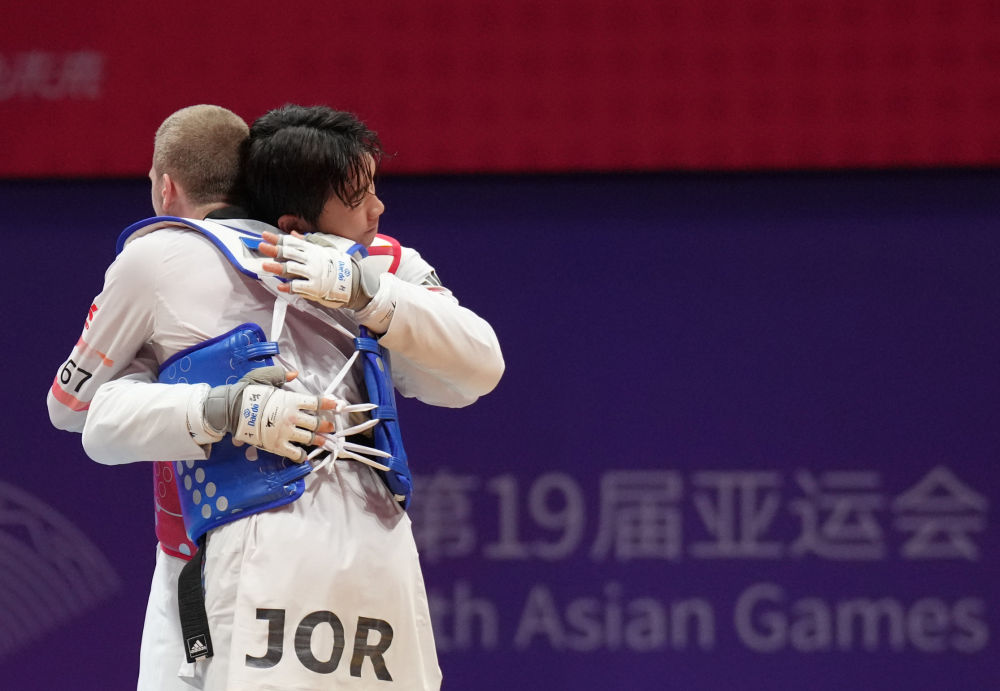 9月27日,韩国选手朴优赫(右)在跆拳道男子80公斤级比赛后安慰约旦选手萨利赫·沙拉巴蒂。