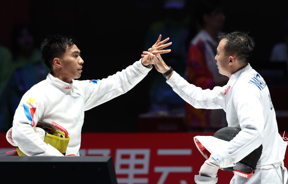9月26日,中国选手王子杰(右)在男子个人重剑八分之一决赛赛后与菲律宾选手诺埃利托·何塞致意。