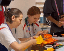 9月25日,一名日本运动员(右)在淳安赛区传统工艺体验坊和志愿者合影。