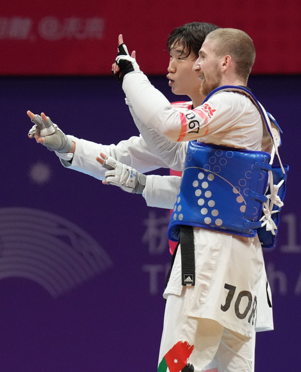9月27日,韩国选手朴优赫(右)在跆拳道男子80公斤级比赛后与约旦选手萨利赫·沙拉巴蒂一起向观众致意。