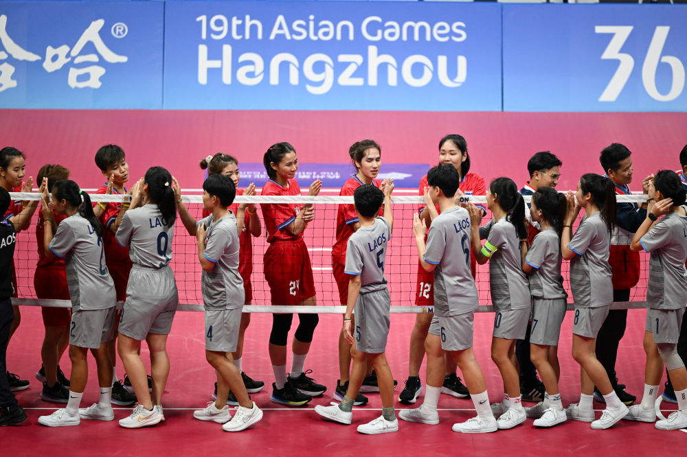 9月28日,泰国队和老挝队(前)在藤球女子单组团体半决赛后互相致意。