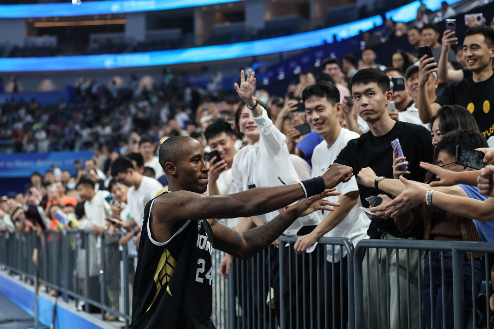 9月28日,约旦队球员伦达·杰斐逊篮球男子预赛C组后与观众互动。