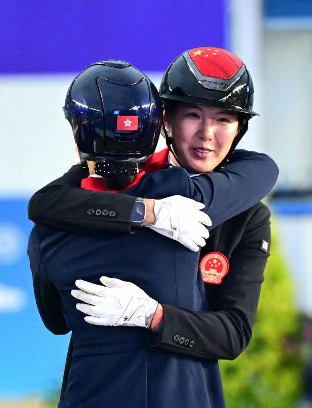 在桐庐马术中心进行的杭州亚运会马术比赛盛装舞步团体赛颁奖仪式上,获得亚军的中国队队员饶嘉怡(右)与获得季军的中国香港队队员萧颖莹相互拥抱祝福(9月26日摄)