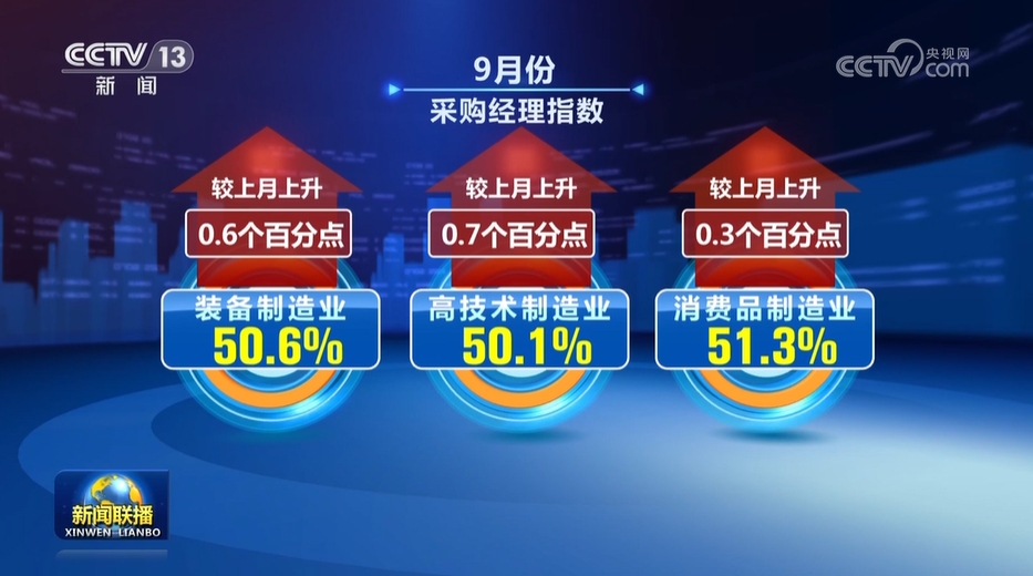 从重点行业来看,采购经理指数全面回升,经济发展的协同性增强。9月份装备制造业、高技术制造业和消费品制造业采购经理指数分别为50.6%、50.1%和51.3%,较上月分别上升0.6、0.7和0.3个百分点。