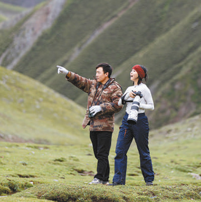 在位于三江源国家公园澜沧江源园区的昂赛大峡谷,牧民桑周(左)带领自然体验者拍摄野生动物。周梦爽摄