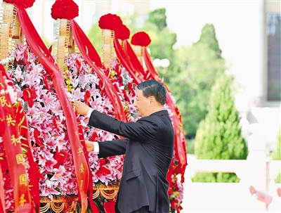 9月30日上午,党和国家领导人习近平、李强、赵乐际、王沪宁、蔡奇、丁薛祥、李希、韩正等来到北京天安门广场,出席烈士纪念日向人民英雄敬献花篮仪式。这是习近平整理花篮上的缎带。新华社记者 殷博古摄
