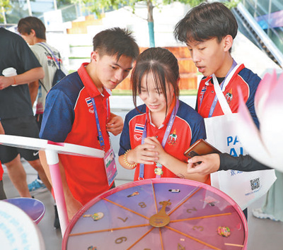 9月29日,杭州亚运村内,泰国体育代表团运动员在观赏徽章。本报记者 张武军摄