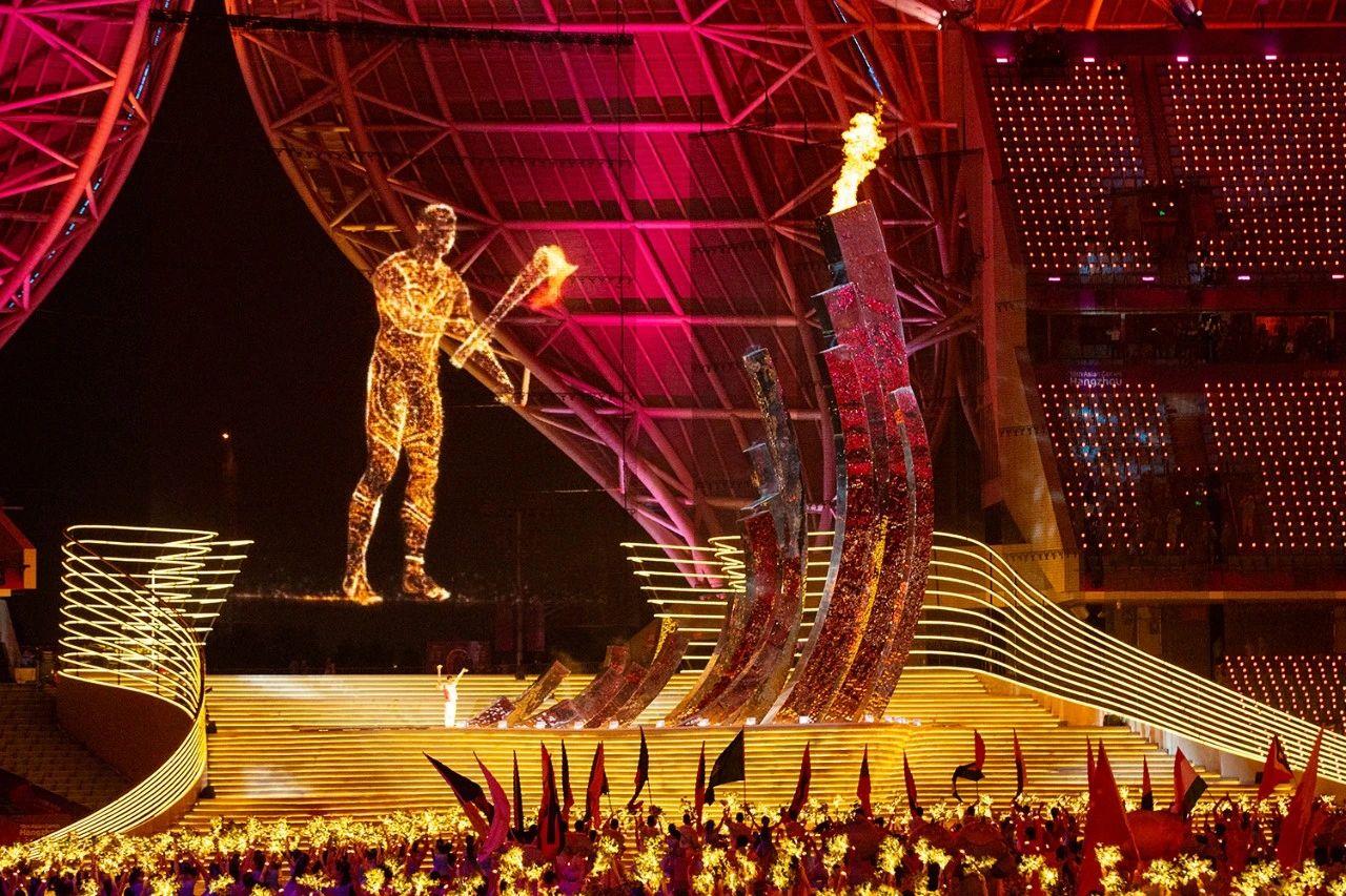 杭州亚运会开幕式上,由超过1亿人参与数字火炬传递汇聚而成的“数字火炬人”,高擎火炬踏浪而来,与最后一棒火炬手汪顺共同点燃“钱江潮涌”主火炬塔。