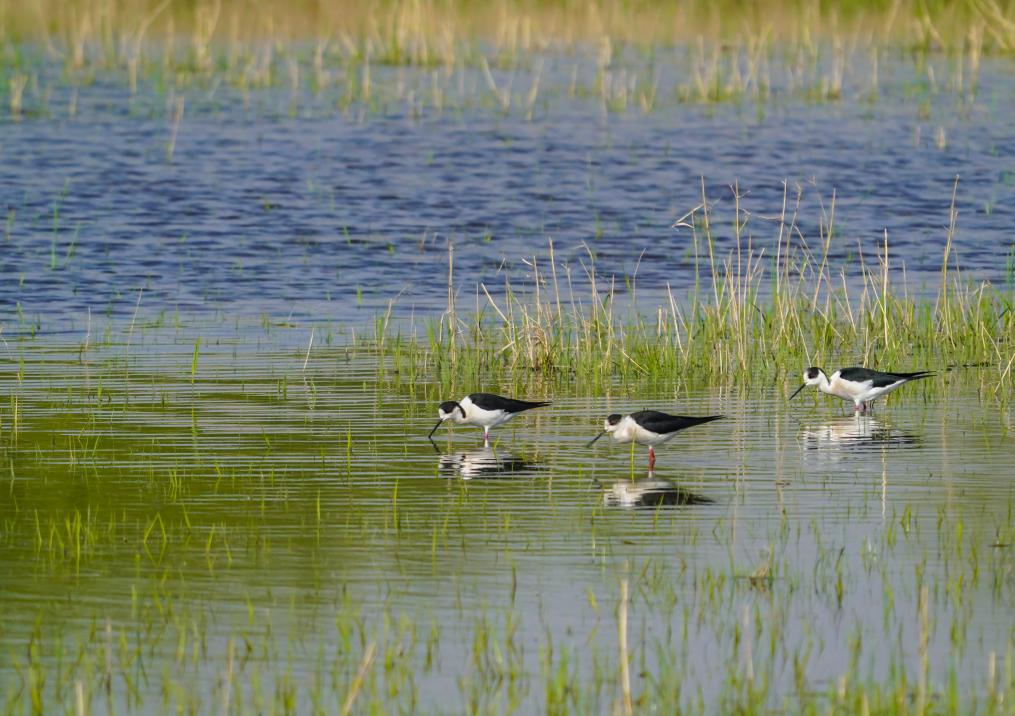 水鸟在蓑衣樊村附近的湿地栖息觅食。(新华社记者邵琨摄)