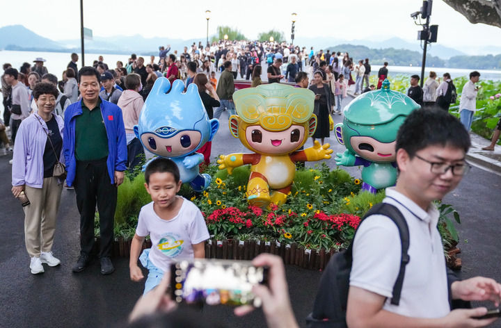 9月23日,游客在西湖边与杭州亚运会吉祥物合影。新华社记者 韩传号 摄
